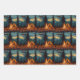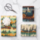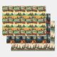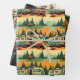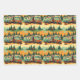 Niedliche Vintage Camping Zelte und Camper in der Waldgeschenkverpackung. Jedes Blatt hat eine einzigartige Camping-Thematik Grafik in grün, blau und orange.