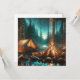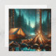 Eine Illustration eines Campingplatzes durch einen See und Pinienbäume mit einem brennenden Lagerfeuer und hübschen, weißen Lichtern über die Bäume.