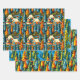 Niedliche Retro-Camping-Zelte, Teepees und RV-Camper in der Waldgeschenkverpackung. Jedes Blatt hat eine einzigartige Camping-Thematik Grafik in grün, blau und orange.