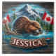 Ein kanadischer Biber baut eine Lodge in der Nähe eines ruhigen Wasserkörpers, umgeben von mächtigen Bergen und üppiger Vegetation unter einem klaren Himmel.