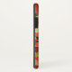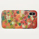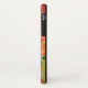 Eine lockere Formation von bunten Ahornblättern fällt sanft vor den Hintergrund eines lebhaften kanadischen Sonnenuntergangs