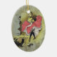 Ovale Keramik mit beidseitigem Bild eines Cancan-Tänzers, der unter einem rosa Rock weiße Unterröcke wirbelt. Sie trägt schwarze Strümpfe und einen schwarzen Scherz um den Hals. Auf dem Bild sind Männer in Smoking gekleidet. Einer ist ein Dirigent, der andere blickt von hinten auf die Bühne. Sehen Sie sich die gesamte Kollektion von Cancan Ornament in den SPEZIELLEN TOUCHS an | Abschnitt Gastgeschenke.