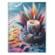 A fantastical notebook cover depicts a brightly colored, stylized beach scene with a ceremonial candle at its center, surrounded by whimsical elements.