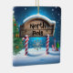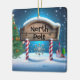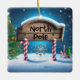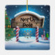 Picture a whimsical signpost, perfect for a festive holiday setting: The sign itself is shaped like a classic wooden plaque, painted with bright, cheerful colors. The lettering reads, “North Pole,” in bold, snowy white script, outlined with glittering red. What makes this sign truly magical are its legs—crafted to look like giant candy canes. Each leg twists in red and white stripes, curving playfully at the base as if freshly plucked from Santa’s workshop. The candy legs support the sign sturdily, while also adding a delightful, sweet touch that captures the spirit of the season. Flurries of snow gather at the bottom, and perhaps a few playful elves or reindeer are depicted nearby, making this sign a charming beacon guiding everyone toward the North Pole.