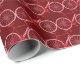 Dieses Verpackungspapier für die Weihnachtsferien-Jahreszeit hat ein Muster roter Fahrräder mit roten und weißen Rohrstreifen aus Zuckerrohr auf dem Rahmen. Der Hintergrund ist dunkelrot. Ideal für Geschenke für Ihre Fahrradfreunde.