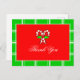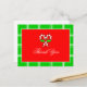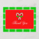 Eine niedliche Dankeschön Postkarte mit Bonbons und Heiligen mit rotem und grünem Hintergrund.
