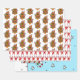 Drei Blätter niedlicher Weihnachtsgeschenkverpackung. Eine hat ein kleines Lebkuchenmuster. Eines hat ein riesiges Lebkuchenhaus, das das ganze Blatt aufnimmt. Die dritte hat Süßigkeiten mit Bögen.