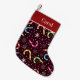 Freuen Sie sich auf einen personalisierten Strumpf mit einem bunten Bonbons und Schneeflocken auf einem dunkelroten Hintergrund. Dieser individuelle Name Strumpf ist perfekt zum Aufhängen am Kamin geeignet und bringt spielerische Urlaubsstimmung und einen farbenfrohen Pop in Ihre Weihnachtsgestalt.