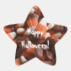 Halloween-Aufkleber mit einem nahen Foto aus Süßmais und Happy Halloween-Wünschen.