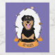 Niedliche Illustration eines Rottweiler Hundes, der von Halloween-Süßigkeiten umgeben lächelt.