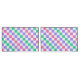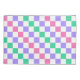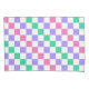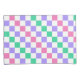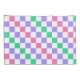 A vibrant checkerboard pattern featuring alternating pastel purple, pink, and green squares against a white background, creating a playful, colorful effect.