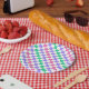 A vibrant checkerboard pattern featuring alternating pastel purple, pink, and green squares against a white background, creating a playful, colorful effect.