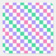 A vibrant checkerboard pattern featuring alternating pastel purple, pink, and green squares against a white background, creating a playful, colorful effect.