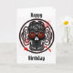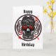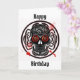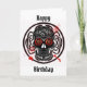Gothische Geburtstagskarte aus Candy-Schädel, dunkel, alternative Begrüßung. Supernatürliche Fantasy digitale Kunst mit einem schwarzen Blumentag des Toten Stils Schädel und Blut Spatter, die auf Teens gerichtet sind. An der Front steht "Happy Birthday". Diese Karte ist leer für Ihre eigene Nachricht.