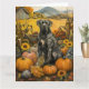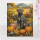 Feiern Sie die Schönheit des Herbstes mit diesem lebendigen Gemälde eines Hundes, der neben einer reichen Erntedank-Ernte sitzt. Die reichen Herbstfarben von Kürbissen, Sonnenblumen und die rustikale Landschaft der Bauernhäuser schaffen eine warme und einladende Atmosphäre, die sich perfekt für jeden Hundefreund im saisonalen Dekor eignet.
