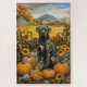 Feiern Sie die Schönheit des Herbstes mit diesem lebendigen Gemälde eines Hundes, der neben einer reichen Erntedank-Ernte sitzt. Die reichen Herbstfarben von Kürbissen, Sonnenblumen und die rustikale Landschaft der Bauernhäuser schaffen eine warme und einladende Atmosphäre, die sich perfekt für jeden Hundefreund im saisonalen Dekor eignet.
