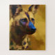 Ein digitales Bild, das Hyperrealismus mit kühner, zeitgenössischer Abstraktion verbindet. Dieses faszinierende Porträt eines afrikanischen Wildhundes zeigt einen harmonischen Zusammenprall von lebhaften Farben, tiefer Blues, goldenen Ochsen und elektrischen Grüntönen, die jedem Fellstrand und jedem Schatten Leben einhauchen. Die strukturierten, beinahe kubistischen Pinselstriche verleihen Tiefe und Bewegung und verwandeln ein einfaches Profil in eine Darstellung von roher Schönheit und emotionaler Intensität.