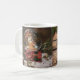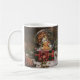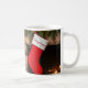 Caneca de natal com um lado a meia na lareira e do outro o globo de neve com urso