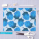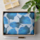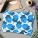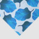 Ein botanisches Illustrationsmuster von Blätter aus der Canna tropicanna Pflanze. Sie sind in tiefblauen Farbtönen gehalten und auf einem sehr hellblauen Hintergrund angeordnet.