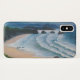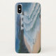 Das Bild zeigt einen nebeligen und bewölkten Tag an der Küste mit den rhythmischen Wellen am Strand.