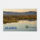 Allein in der Wildnis. Im Inneren von Alaska liegt ein Kanu, in dem das spiegelglatte Wasser des Sees fließt. In der Ferne typische Taiga und Berge. Es erscheint auch das Textlesen "Alaska". Dieses Bild ist von einem Foto des United Staaten Fish and Wildlife Service abgeleitet.