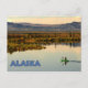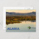 Allein in der Wildnis. Im Inneren von Alaska liegt ein Kanu, in dem das spiegelglatte Wasser des Sees fließt. In der Ferne typische Taiga und Berge. Es erscheint auch das Textlesen "Alaska". Dieses Bild ist von einem Foto des United Staaten Fish and Wildlife Service abgeleitet.