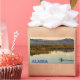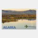 Allein in der Wildnis. Im Inneren von Alaska liegt ein Kanu, in dem das spiegelglatte Wasser des Sees fließt. In der Ferne typische Taiga und Berge. Es erscheint auch das Textlesen "Alaska". Dieses Bild ist von einem Foto des United Staaten Fish and Wildlife Service abgeleitet.