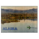Allein in der Wildnis. Im Inneren von Alaska liegt ein Kanu, in dem das spiegelglatte Wasser des Sees fließt. In der Ferne typische Taiga und Berge. Es erscheint auch das Textlesen "Alaska". Dieses Bild ist von einem Foto des United Staaten Fish and Wildlife Service abgeleitet.