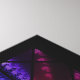 Ein digitales Buntglasdesign im Art-Déco-Stil, das im 20. Jahrhundert beliebt war. Das weithin verwendete Sonnenburstmotiv ist zentral und erhebt sich hinter einer grünen Landschaft, die von einem Baum auf der einen Seite und Wolken und Blume auf der anderen Seite ausgeglichen wird. Geometrische Formen werden verwendet, um die Symmetrie der Szene zu betonen, wobei der Baum und die Wolken aus überlappenden Kreisen bestehen. Verschiedene farbenfrohe Fraktal verleihen der "gläsernen" Textur und dem Interesse. Die Szene ist gerahmt in schwarzen Eisenarbeiten und diamantförmigen Blöcken, mattiert mit dunklen, aber lebendigen Fraktal-Mustern.
