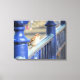 Brauner Spatzen, der auf einem Geländer aus blauem Eisenzaun sitzt.