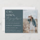 GAP, GOWN, es geht runter! Zeitgenössische Graduierungspartei Foto Einladung. Modernes typografisches Design mit aquamarinem Hintergrund mit Imitaten silbergeometrischer Musterunterlage.