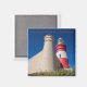 Kühlschrankmagnet mit einem Farbbild des Cape Agulhas Leuchtturms, am südlichsten Punkt Südafrikas, aus einem niedrigen Winkel zum blauen Himmel aufgenommen.