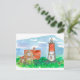 Eine Postkarte mit dem Leuchtturm Nauset auf Cape Cod, Massachusetts mit hellrotem Dach und wütenden lila Wildblumen illustriert mit Tinte und Aquarell.