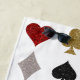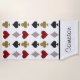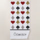 Dieses individuell gestaltete Strandtuch ist mit einem Poker- oder Casino-Spielkartenmotiv und den Symbolen für die verschiedenen Anzug ausgestattet. Die Herzen sind rot gedruckt, die Vereine in Gold, die Pik in Schwarz und die Diamanten in Silber. Die Bilder werden in einem gefliesten Muster über den Teppich gedruckt. Ein Beispielname wird unten gedruckt. Sie können das Handtuch so gestalten, dass es Ihren eigenen individuelle Name oder einen anderen Text enthält.