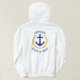 Ein speziell entworfener (Vor- und Rücken-) nautischer Bootsanker, goldene Lorbeerfische und ein goldener Stern mit Captain Rank oder einem anderen Titel und Ihrem personalisierten Namen oder Bootsnamen auf einem weißen Kapuzen. Macht ein großartiges Geschenk.