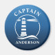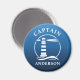 Stilvoll runder Kühlschrank Magnet mit Kapitän oder anderem Titel, Ihr personalisierter Name und ein individueller klassischer Leuchtturm mit Ozeanwellen in Weiß in Meeresblau oder wählen Sie Hintergrundfarben, um Ihre Einrichtung. Macht ein großartiges, einzigartiges Geschenk.
