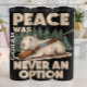 Diese humorvolle Grafik zeigt eine große Capybara, gezeichnet in einem klassischen Cartoon-Stil, mit einem Shotgun. Das Design beinhaltet den witzigen Text "PEACE WAS NIE AN OPTION" in einem Not leidenden Schriftart, der ein einzigartiges und lustiges Statement-Stück schafft.