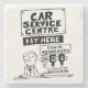 Car Service Center bei einer Firma für Kfz-Reparaturen, Kfz-Reparaturen und Fahrzeugmechanik. Spaß Cartoon Illustration eines Mechanikers hinter dem Schreibtisch bereit zur Zahlung. Es gibt alkoholische Getränke auf Optik unter dem Sprichwort "Shock Absorbers".