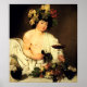 Caravaggio Bacchus Poster. Ölmalerei auf Leinwand aus dem Jahr 1595. Bacchus ist eines der bekanntesten Gemälde des italienischen Künstlers Caravaggio. Die Arbeit zeigt einen jungen Mann als klassischer Gott Bacchus gekleidet mit Blätter und Trauben im Haar und einer Schüssel Früchte sitzen vor ihm. Das Gemälde enthält bekanntermaßen eine Weinkaraffe, in der das Bild des Malers auf seinem Aal zu sehen ist. Auch das Weinglas, das der junge Mann hält, enthält sein Spiegelbild. Ein großartiges Geschenk für Liebhaber von Caravaggio, Barockkunst, Mythologie-Gemälden und Wein.