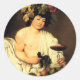 Caravaggio Bacchus Aufkleber. Ölmalerei auf Leinwand aus dem Jahr 1595. Bacchus ist eines der bekanntesten Gemälde des italienischen Künstlers Caravaggio. Die Arbeit zeigt einen jungen Mann als klassischer Gott Bacchus gekleidet mit Blätter und Trauben im Haar und einer Schüssel Früchte sitzen vor ihm. Das Gemälde enthält bekanntermaßen eine Weinkaraffe, in der das Bild des Malers auf seinem Aal zu sehen ist. Auch das Weinglas, das der junge Mann hält, enthält sein Spiegelbild. Ein großartiges Geschenk für Liebhaber von Caravaggio, Barockkunst, Mythologie-Gemälden und Wein.