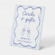 Guide guests with this charming Cards & Gifts baby shower sign designed in a light blue, blue, and white palette. The artwork features cute hand-drawn soda bottles tied with bows, a playful wavy frame, and a soft striped background that complements a She’s Ready to Pop baby boy theme. The handwritten-style font adds a warm, welcoming touch—perfect for decorating your gift table, entry area, or favor display.