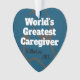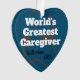 Caregiver Heart Shaped Blue Customized Christmas Ornament ist eine großartige Geschenk-Idee für die Person, die kümmert sich um einen Freund oder geliebt. Beide Seiten des Ornaments haben einen marineblau-Hintergrund mit grauem Stethoskop und der Phrase "Weltgrößter Fürsorger"sowie personalisierten Namen und Jahreszeiten.