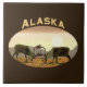 Zwei Karibu-Bullen ringen während des Sturzes rutschen im Norden, während die Sonne im Hintergrund Sets. Es erscheint auch das Textlesen "Alaska".