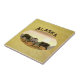 Zwei Karibu-Bullen ringen während des Sturzes rutschen im Norden, während die Sonne im Hintergrund Sets. Es erscheint auch das Textlesen "Alaska". Das Bild ist auf einem braunen Lederhintergrund überlagert.