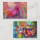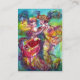 Farbenfrohe, elegante und lebendige Kunsteinladung. Romantische Karnevaltänzer : Künstlerische, skurrile, ausdrucksvolle Tanzfiguren, wunderschöne blonde Frau in gefiederten, funkelnden Kostümen tanzt mit einem jungen Harlequin mit goldener rote Rose auf der Rückseite der Karte.