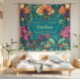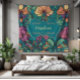Ein lebendiges Blumenmuster mit großen pfirsichfarbenen und violetten Blüten, verwoben mit einem farbenprächtigen türkisfarbenen und blauen Weinhintergrund.