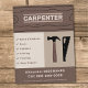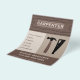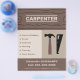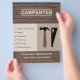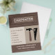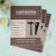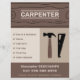 Ein Flyer mit dem auf einem Holzboden geschriebenen Carpenter und auf dem links eine Darstellung eines Hammers und einer Säge in beigen Tönen. Auch mit Kontaktdaten und einer vollständigen Liste der Dienstleistungen. Perfekt für die Holzbearbeitung beruflich wie Schreiner, Schrank, Holzbau, etc.