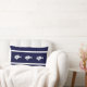 ein Teil der zum Thema Ozean gehörenden Dekoration ist weißer Fisch auf blauem Kissen auf der einen Seite und ein blau-weißer Streifen auf der anderen Seite.