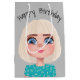 Niedliches Cartoon Mädchen mit blonden Haaren und großen Augen auf grauem Hintergrund und Happy Birthday Text. Text kann bearbeitet oder gelöscht werden. Die Hintergrundfarbe kann geändert werden.