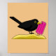 Niedlicher, lustiger Cartoon Kawaii Blackbird, der an einem sonnigen Sommertag am Strand einen Popsikel isst. Das Eis ist Erdbeergeschmack und genießt es wirklich.